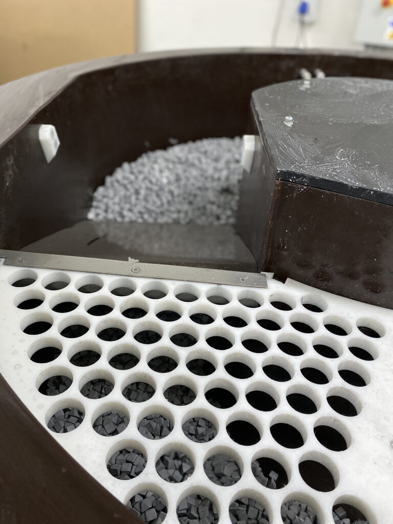 Utilizamos abrasivos plásticos para un tratamiento más suave de materiales blandos, utilizados para el desbarbado suave, el redondeo de cantos y el pulido de latón, aluminio y cobre, y abrasivos cerámicos, que son muy versátiles, ideales para el lijado agresivo y el redondeo de cantos de materiales más duros y resistentes, pero también para el desbarbado de materiales más blandos como el aluminio y el latón.