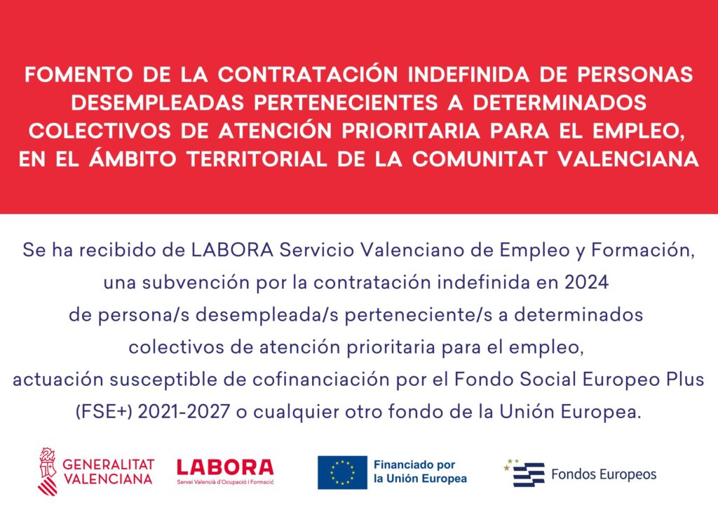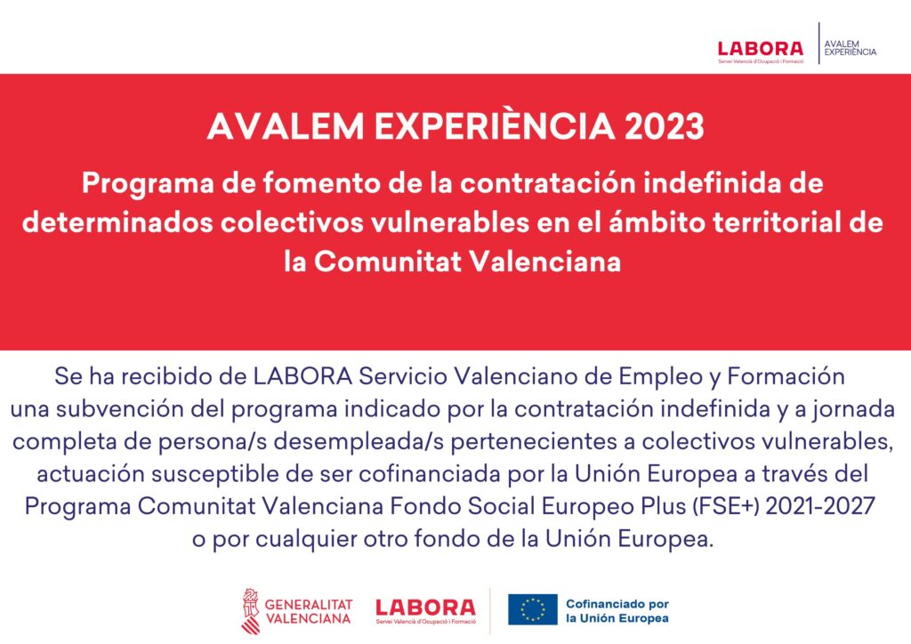 Esta entidad, ha percibido de LABORA, Servicio Valenciano de Empleo y Formación, y la subdirección General de ocupación, la cantidad de 25.200.-€, destinada al fomento de la ocupación para la contratación indefinida inicial, de personas jóvenes cualificadas (AVALEM JOVES) en el marco del Sistema Nacional de Garantía Juvenil.